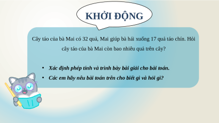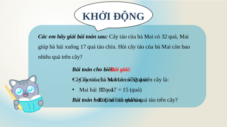 còn số quả trên cây là: • Mai hái 17 quả. 32 – 17 = 15 (quả)