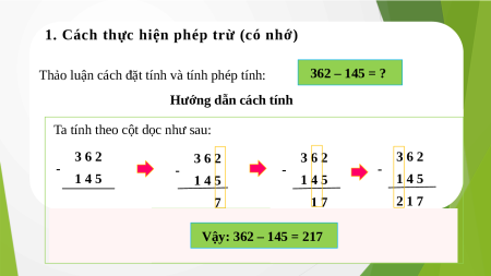 Thảo luận cách đặt tính và tính phép tính: 362 – 145 = ?