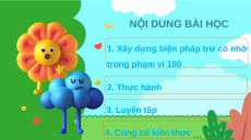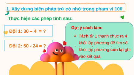 1. Xây dựng biện pháp trừ có nhớ trong phạm vi 100 2. Thực hành 3. Luyện tập