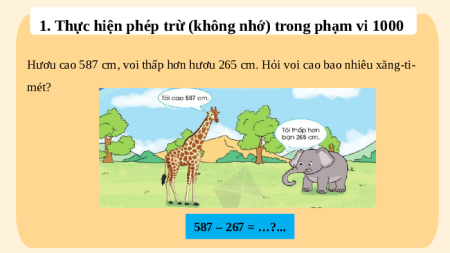 Hươu cao 587 cm, voi thấp hơn hươu 265 cm. Hỏi voi cao bao nhiêu xăng-ti- mét? 587 – 267 = …?...