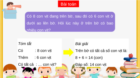 Trên bờ có tất cả số con vịt là: Thêm : 6 con vịt 8 + 6 = 14 (con)