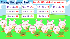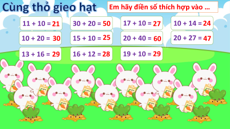 Em hãy điền số thích hợp vào … 11 + 10 = 21 30 + 20 = 50 17 + 10 = 27 10 + 14 = 24 10 + 20 = 30 15 + 10 = 25 20 + 40 = 60 20 + 27 = 47 13 + 16 = 29 16 + 12 = 28 19 + 10 = 29