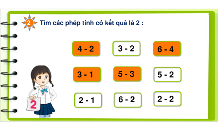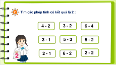 Tìm các phép tính có kết quả là 2 : 4 - 2 3 - 2 6 - 4 3 - 1 5 - 3 5 - 2 2 - 1 6 - 2 2 - 2