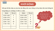 trong Bảng 11 và Bảng 12 (đơn vị: mét): Nhóm Tần số Nhóm Tần số Kết quả nhảy xa của [6,22; 6,46) 3 [6,22; 6,46) 2 vận động viên nào [6,46; 6,70) 7 [6,46; 6,70) 5 đồng đều hơn? [6,70; 6,94) 5 [6,70; 6,94) 8 [6,94; 7,18) 20 [6,94; 7,18) 19 [7,18; 7,42) 5 [7,18; 7,42) 6