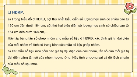 Hãy lập bảng tần số ghép nhóm cho mẫu số liệu ở HĐKĐ, xác định giá trị đại diện