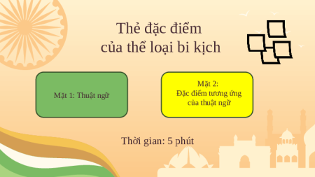 - Khái niệm, cốt truyện, nhân vật, hành động, ngôn ngữ trong bi kịch Thẻ đặc điểm của thể loại bi kịch Mặt 2: Mặt 1: Thuật ngữ Đặc điểm tương ứng của thuật ngữ Thời gian: 5 phút