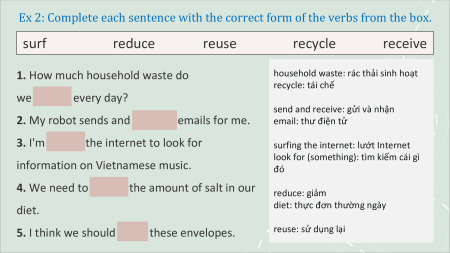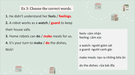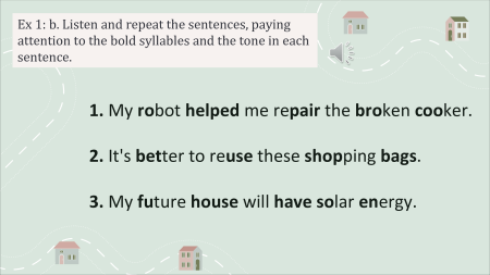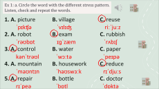 Listen, check and repeat the words. 1. A. picture B. vil age C. reuse ˈpɪkʧə ˈvɪlɪʤ riːˈjuːz 2. A. robot B. exam C. rubbish ˈrəʊbɒt ɪɡˈzæm ˈrʌbɪʃ 3. A. control B. water C. paper kənˈtrəʊl ˈwɔːtə ˈpeɪpə 4. A. mountain B. housework C. reduce ˈmaʊntɪn ˈhaʊswɜːk rɪˈdjuːs 5. A. repair B. bottle C. doctor rɪˈpeə ˈbɒtl ˈdɒktə