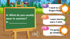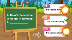 It’s cool and cloudy. A: How’s the weather in Ha Noi in summer? It’s hot and sunny. B: ____________ BACK
