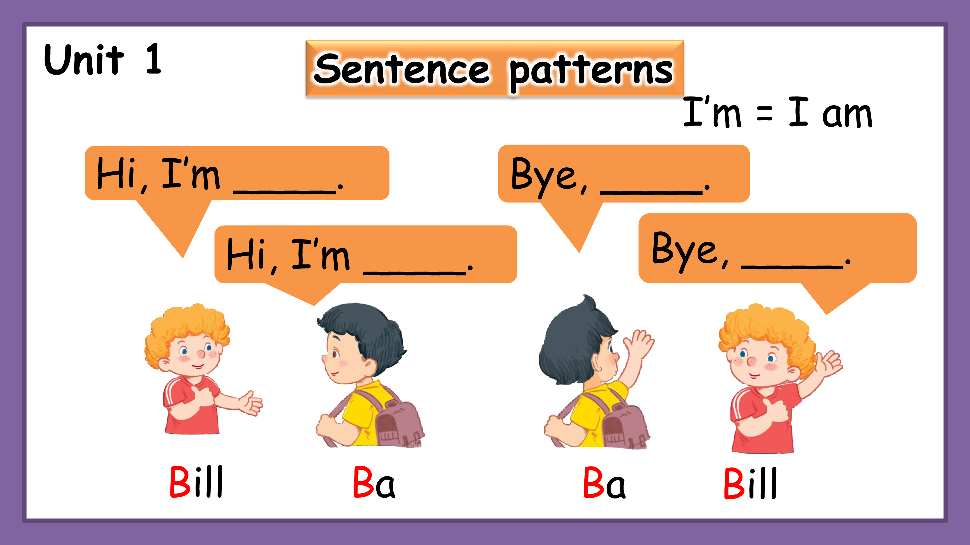 Sentence patterns I’m = I am Hi, I’m ____. Bye, ____. Hi, I’m ____. Bye, ____. Bill Ba Ba Bill
