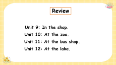 Review 3 Lesson 1 Review Unit 9: In the shop. Unit 10: At the zoo.