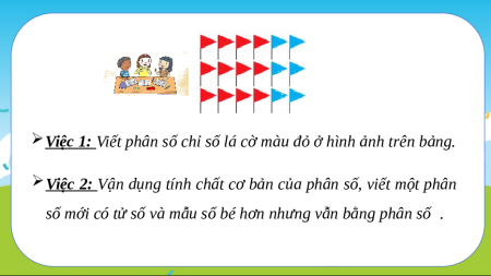 Việc 1: Viết phân số chỉ số lá cờ màu đỏ ở hình ảnh trên bảng.