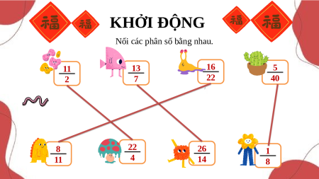 Nối các phân số bằng nhau. 11 13 16 5 2 7 22 40 8 22 26 1 11 4 14 8 BÀI T 56 IẾT 1 RÚT GỌN RÚT PHÂN SỐ GỌN PHÂN SỐ