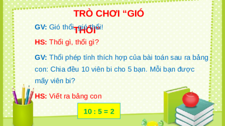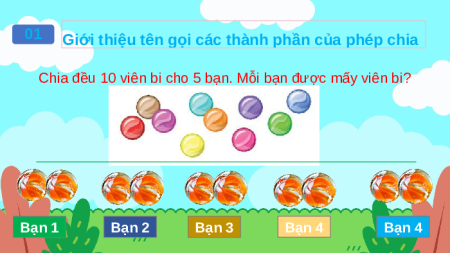 con: Chia đều 10 viên bi cho 5 bạn. Mỗi bạn được mấy viên bi?