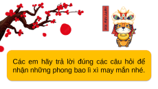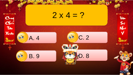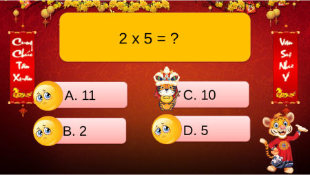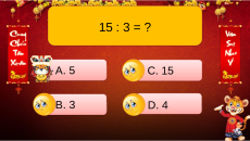 nhận những phong bao lì xì may mắn nhé. 2 x 5 = ? A. 11 C. 10 B. 2 D. 5 15 : 3 = ? A. 5 C. 15 B. 3 D. 4