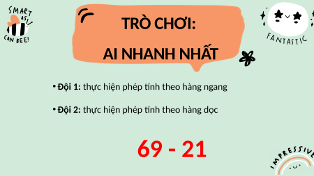 • Đội 2: thực hiện phép tính theo hàng dọc 69 - 21 Bài 3: