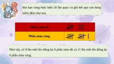 Hai bạn cùng thực hiện 20 lần quay và ghi kết quả vào bảng kiểm đếm như sau: Phần màu đỏ Phần màu vàng
