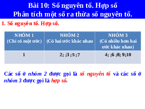(Chỉ có một ước) (Có hai ước khác nhau (Có nhiều hơn hai ước khác nhau) 1 2; 3; 5; 7 4; 6; 8; 9 ;10 Bài 10