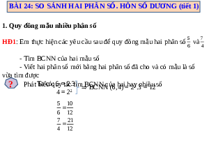 2.3 m BCNN của hai hay nhiều số BCNN (6,4) = 22.3 = 12 4 = 22 5 10 6 12 7 21 4 12 BÀI BÀ 24: I 24: SO SO SÁ NSÁ H NH HA H I AI PH PHÂN ÂN SỐ. S Ố. H HÔNÔN SỐ SỐ D DƯƠ ƯƠN N G G (tiết 1)