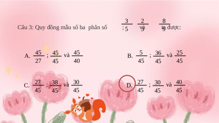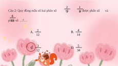 Câu 2: Quy đồng mẫu số hai phân số và ta được phấn số và 3 4 8 phân 12 số …?… A. 2 B. 4 12 14 C. 3 D. 5 12 34
