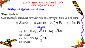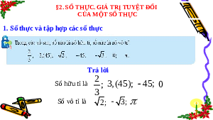 1. Số thực và tập hợp các số thực Trả lời 2 Số hữu tỉ là ; 3,(45); 45; 0 3 Số vô tỉ là 2; 3;