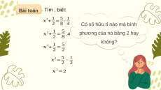 phương của nó bằng 2 hay 2 8 không? 1 5 𝑥2+ = 2 2 5 1 𝑥2= − 2 2 𝑥2=2 BÀI 1. SỐ VÔ TỈ.