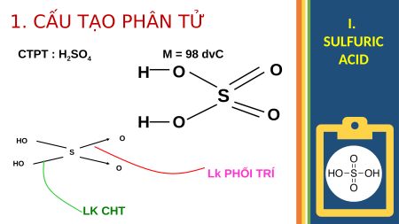 SULFURIC ACID VÀ MUỐI SUNFATE KẾT NỐI TRI THỨC A. SULFURIC ACID KẾT NỐI TRI THỨC 1. CẤU TẠO PHÂN TỬ I. SULFURIC CTPT : H SO M = 98 dvC 2 4 ACID H O O S H O O O HO S HO O Lk PHỐI TRÍ LK CHT 2.. TÍNH CHẤT VẬT LÝ I. SULFURIC ACID