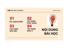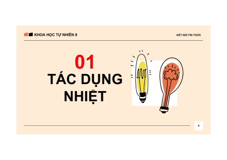 GIÁO VIÊN: Nguyễn Xuân Phương 2 KHOA HỌC TỰ NHIÊN 8 KẾT NỐI TRI THỨC 01 02 TÁC DỤNG NHIỆT TÁC DỤNG PHÁT SÁNG 03 04 TÁC DỤNG TÁC DỤNG SINH LÍ NỘI DUNG HÓA HỌC BÀI HỌC 3 KHOA HỌC TỰ NHIÊN 8 KẾT NỐI TRI THỨC 01 TÁC DỤNG NHIỆT 4