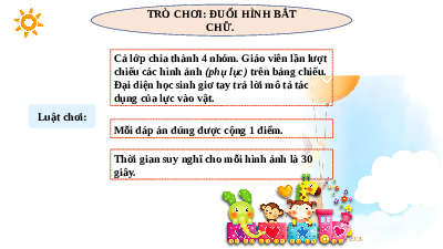 1. Giáo viên bấm 1 cái, xuất hiện 1 hình. Giáo viên đặt câu hỏi: ? Mô tả lực trong hình.