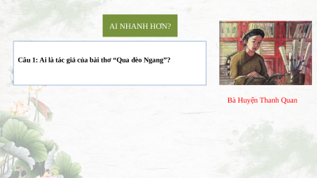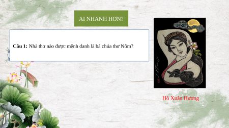 Câu 1: Nhà thơ nào được mệnh danh là bà chúa thơ Nôm? Hồ Xuân Hương
