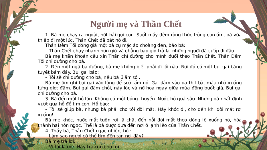 2. Đến một ngã ba đường, bà mẹ không biết phải đi lối nào. Nơi đó có một bụi gai băng