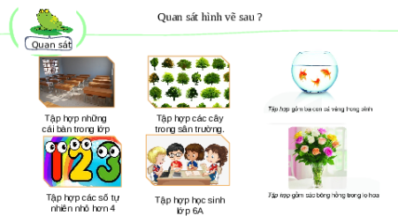 nhiên. Thật dễ dàng và thuận tiện ! BÀI 1: TẬP HỢP Quan sát hình vẽ sau ? Quan sát Tập hợp những Tập hợp các cây cái bàn trong lớp trong sân trường. học Tập hợp các số tự Tập hợp học sinh nhiên nhỏ hơn 4 lớp 6A