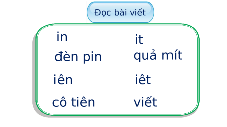 TIẾNG VIỆT 1 Tập 1 Tuần 13 Tập viết: Tiết 25 Khởi động Đọc bài viết in it đèn pin quả mít iên iêt cô tiên viết Nhận xét bài viết