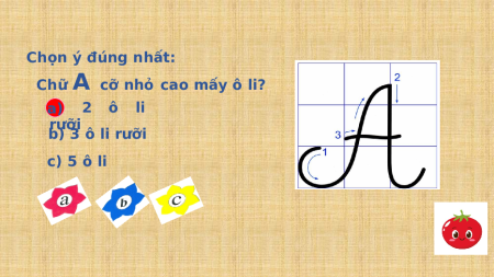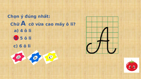 Chữ A cỡ vừa cao mấy ô li? a) 4 ô li b) 5 ô li c) 6 ô li