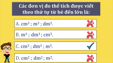 theo thứ tự từ bé đến lớn là: A. cm3 ; m3 ; dm3. B. m3 ; dm3 ; cm3. C. cm3 ; dm3 ; m3. D. cm2 ; dm2 ; m2. 1m3 = ……. dm3 A. 10 B. 1000 C. 100 C. 10000