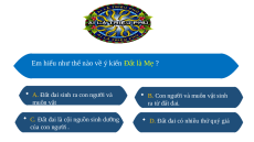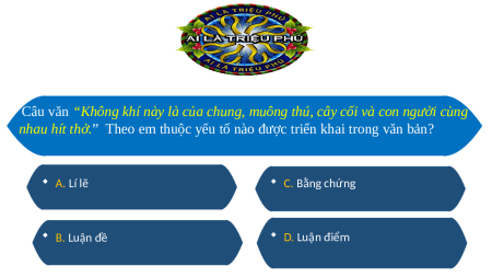 nhau hít thở.” Theo em thuộc yếu tố nào được triển khai trong văn bản? A. Lí lẽ C. Bằng chứng B. Luận đề D. Luận điểm