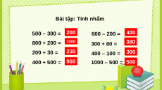 Bài tập: Tính nhẩm 500 – 300 = 200 600 – 200 = 400 1000 800 + 200 = 380 300 + 80 = 200 + 30 = 230 300 400 – 100 = 400 + 500 = 900 1000 – 500 = 500 BÀI 13:
