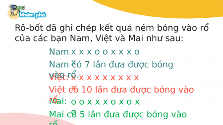 Các bạn Nam, Việt và Mai đang tập ném bóng vào rổ. Mỗi dấu x là 1 lần ném bóng vào rổ. Mỗi dấu O là 1 lần ném trượt.