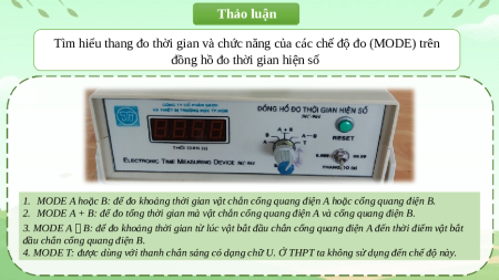 1. MODE A hoặc B: để đo khoảng thời gian vật chắn cổng quang điện A hoặc cổng quang điện B.