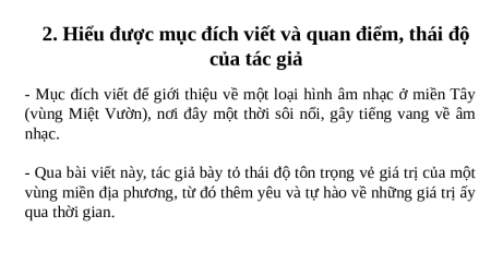 2. Hiểu được mục đích viết và quan điểm, thái độ của tác giả