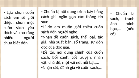 - Chuẩn bị nội dung trình bày bằng - Chuẩn bị sách em sẽ giới