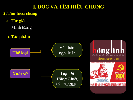 I. ĐỌC VÀ TÌM HIỂU CHUNG 2. Tìm hiểu chung a. Tác giả - Minh Đăng b. Tác phẩm Văn bản Thể loại nghị luận Xuất xứ Tạp chí Hồng Lĩnh, số 170/2020