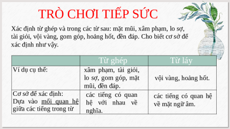 tài giỏi, vội vàng, gom góp, hoảng hốt, đền đáp. Cho biết cơ sở để xác định như vậy. Từ ghép Từ láy Ví dụ cụ thể: xâm phạm, tài giỏi, lo sợ, gom góp, mặt vội vàng, hoảng hốt. mũi, đền đáp. Cơ sở để xác định: các tiếng có quan các tiếng có quan hệ