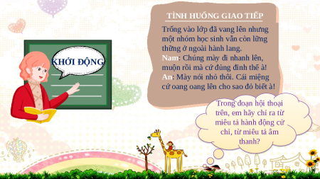 cứ oang oang lên cho sao đỏ biết à! Trong đoạn hội thoại trên, em hãy chỉ ra từ miêu tả hành động cử chỉ, từ miêu tả âm thanh?