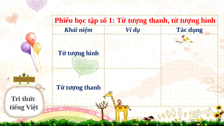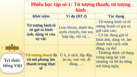 Phiếu học tập số 1: Từ tượng thanh, từ tượng hình Khái niệm Ví dụ Tác dụng Từ tượng hình Từ tượng thanh Tri thức tiếng Việt