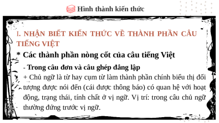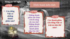 Bảng câu hỏi ngắn Câu 1 Hình thành kiến thức • Câu tiếng Câu 2 Việt có những • Những thành Câu 3 thành phần nào được xem là nòng phần nào? Các thành phần cốt của câu?