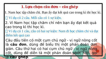 cốt, dùng để diễn tả một phán đoán phức hợp, gọi là câu ghép. 1. L a ự ch n ọ câu đ n ơ – câu ghép