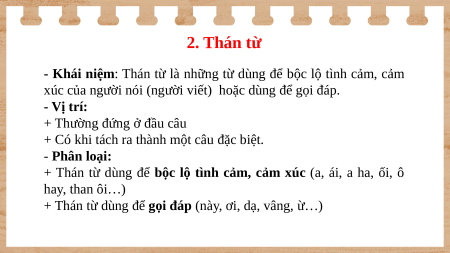 - Khái niệm: Thán từ là những từ dùng để bộc lộ tình cảm, cảm