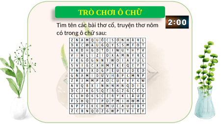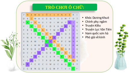Tìm tên các bài thơ cổ, truyện thơ nôm có trong ô chữ sau: TRÒ CHƠI Ô CHỮ: • Khóc Dương Khuê • Chinh phụ ngâm • Truyện Kiều • Truyện Lục Vân Tiên • Nam quốc sơn hà • Phò giá về kinh