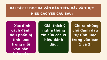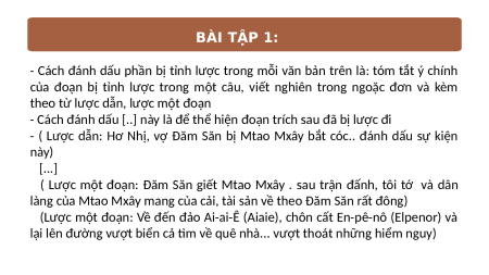 HIỆN CÁC YÊU CẦU SAU: - Xác định - Giải thích ý - Chỉ ra những cách đánh nghĩa thông chỗ đánh dấu dấu phần bị tin của các kí sự tỉnh lược tỉnh lược hiệu đánh trong văn bản trong mỗi dấu. 1 và 2. văn bản (nếu có). BÀI TẬP 1: