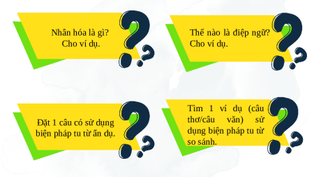 Đấu trường tu từ Nhân hóa là gì? Thế nào là điệp ngữ? Cho ví dụ. Cho ví dụ. Tìm 1 ví dụ (câu Đặt 1 câu có sử dụng thơ/câu văn) sử
